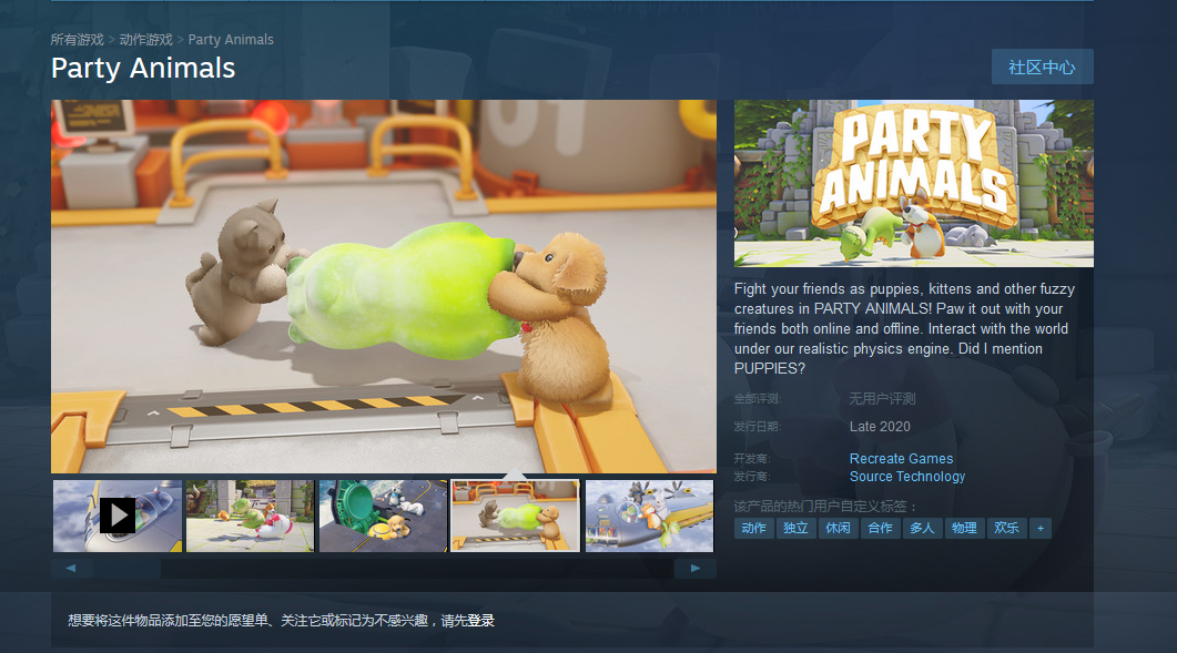 根据Steam商城公开的新消息,一款名为《Party Animals》(暂译为《动物派对》)的萌系多人对战游戏目前已经上架Steam商城页面,该游戏将于2020年晚些时候正式上市,以下为哦官方公开的游戏介绍内容。