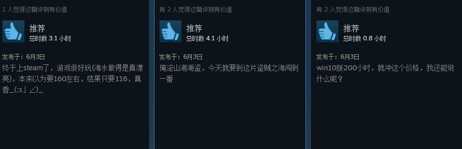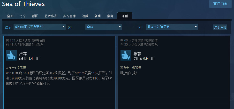 《盗贼之海》Steam国区售价116元,这一定价被不少玩家称赞。有玩家表示“win10商店349港币的《腐烂国度2》终极版,到了steam只卖99人民币。《贼海》59.99美元的价位直接被砍成39.99美元,国区更是只卖116,除了吹微软我想不到别的还能做什么?”,“还是得开UU加速器,但是相比win10商店的,有极大的优势。简体中文终于支持了,116元真的不算贵,网络比win10商店的好不少!!!”。