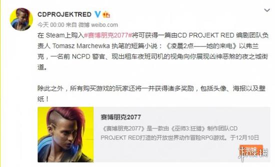 今日凌晨CDPR官博宣布在Steam上购入《赛博朋克2077》的玩家即可获得一篇由CD PROJEKT RED 编剧团队负责人 Tomasz Marchewka 执笔的短篇小说:《凌晨2点——她的来电》以弗兰克,一名前 NCPD 警官、现出租车夜班司机的视角向你展现凶神恶煞的夜之城街道。除此之外,所有购买游戏的玩家还将一并获得诸多奖励,包括头像、海报以及壁纸!
