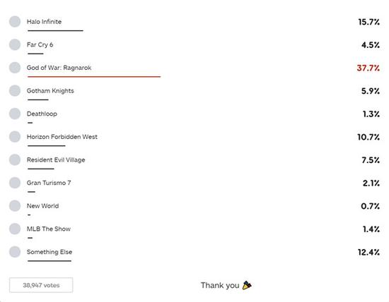 此外,IGN还在官网向读者发布了2021年最令人兴奋的游戏,《战神:诸神黄昏》以37.7%得票率的绝对优势登顶,其次是《光环:无限》,《地平线:禁忌西部》和《生化8》。