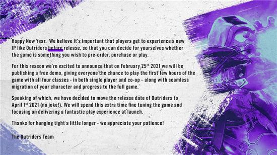 《Outriders》此前已经从2020年夏季上市推迟到2021年2月,这次是第二次延期。在官方对于游戏延期的公告中,他们提到了让玩家在购买或预定这样一个全新IP之前进行体验是十分有必要的,因此游戏会在2月25日推出1个小时内容的试玩版,玩家可以体验游戏中的全部四个职业以及单人和多人协作玩法。