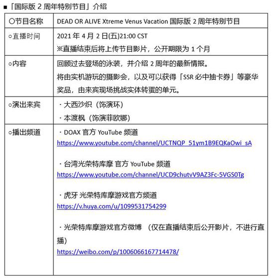 除了游戏外,为纪念服务开始 2 周年,4 月 2 日晚上 8 点(CST)将于 YouTube/ 虎牙进行国际版首次的 WEB 节目‘DEAD OR ALIVE Xtreme Venus Vacation 国际版 2 周年特别节目’。当天邀请了饰演环的‘大西沙织’、饰演菲欧娜的‘本渡枫’。和豪华来宾一同迎接 2 周年的盛事吧。