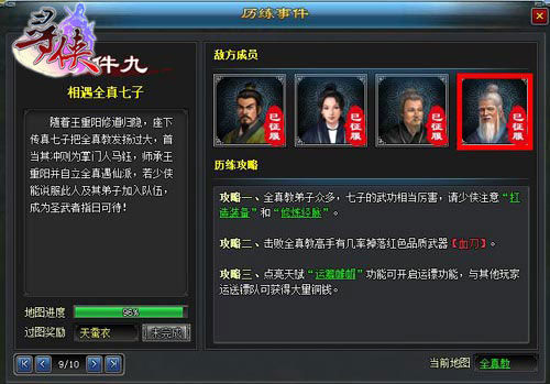 全真一脉以剑法为尊,全真剑法技能攻击单体强悍,其余几人为遁甲高手、雄狮锤手、雪山刀客和玄铁剑客。第一列作战的是遁甲高手,第二列则是雄狮锤手、雪山刀客、马钰依次排列。而第三列则是玄铁剑客。以战力而言,江湖之中无人能出其右,因此想要收服马钰唯有以擅于防御的少林罗汉阵降低对方的伤害,然后再且战且进徐徐图之。