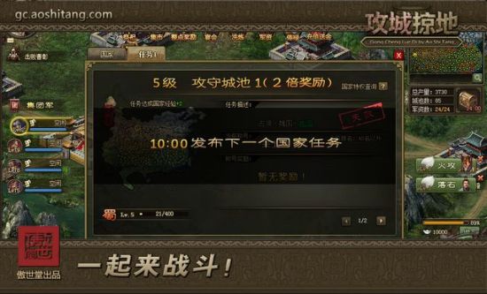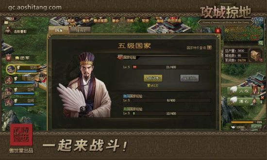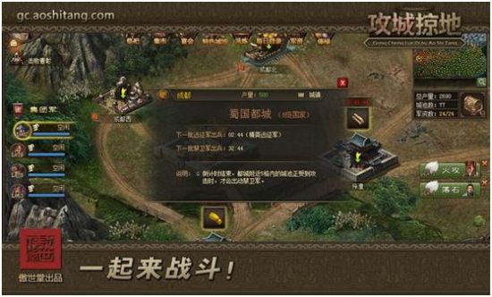 玩三国,国战当先!傲世堂《攻城掠地》不删档内测火爆难挡,嘹亮奏响三国国战新战歌。抢先登陆:http://gc.aoshitang.com/,尽享那波澜壮阔的战争宏图上,自由调兵遣将、无拘开疆扩土,统御天下,成就霸业!