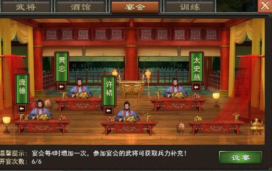 武将方面:武将是玩家成就霸业的基础,武将上阵杀敌,文官计谋助阵,资质越高的武将对于玩家整体战力的提升越有帮助。所以点击武将,玩家就可以从酒馆中进行招募、设宴、训练。