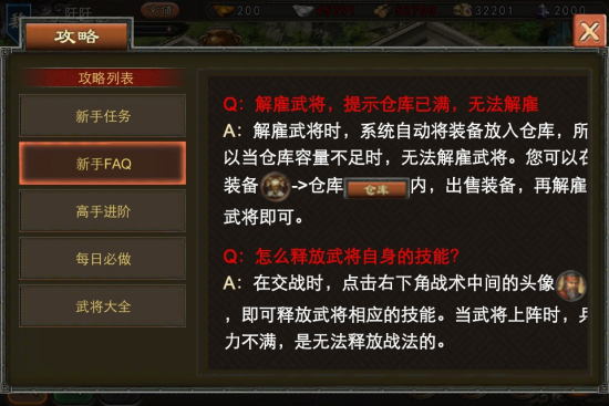 作为新手玩家,如果你不太懂,还可以点击右下方的攻略。在这里会提供新手任务、新手FAQ、高手进阶、每日必做、武将大全。