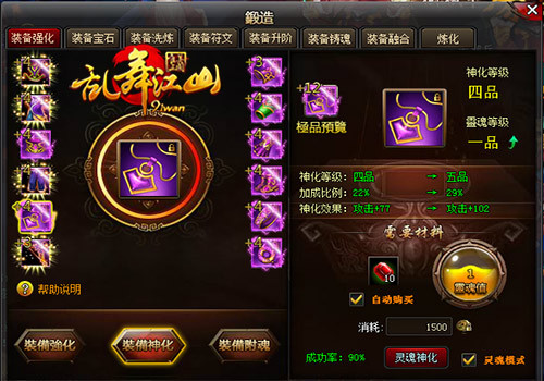 在91wan《乱舞江山》神化界面的右下角,勾选灵魂模式,面板会出现灵魂等级、灵魂值、直接提升箭头按钮,以及灵魂神化按钮,灵魂神化需要消耗一定的神化石。另外普通神化和灵魂神化两种不同模式相互切换的情况下,装备神化等级仍可保持不变。