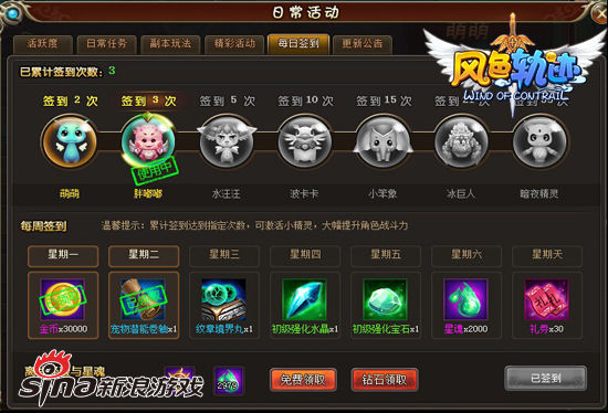 这么可爱又强力的小伙伴,想要拥有一定很难吧?实际上,所有勤劳的玩家都可以通过每日签到来激活小精灵。签到两次即可激活萌萌,累计签到10次即可激活波卡卡,累计签到50次可激活附有最强大属性的烈焰战魂。所以,只要每天登陆新浪游戏《风色轨迹》来签到,你也会获得属于你的萌怪小精灵哦~