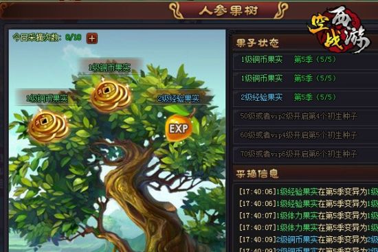走进一看,居然是人参果树呀,真是开大眼了!要知道,这可是一颗神奇的人参果树,它能够产出元宝、铜币、经验、元魂、体力等果实。每个果子一共可以成长5季,每个季节里,果子都有可能发生变异或者升级,如果变异,则会变异成同等级的其他果子。看来庄园主人首要任务就是保护好这棵人参果树啦!