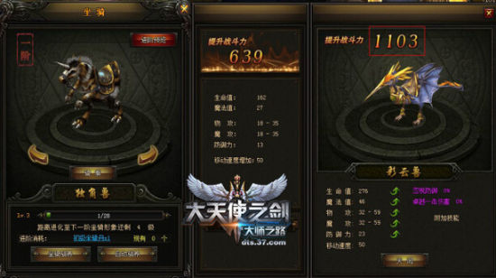 在37《大天使之剑》中,当我们领取到坐骑独角兽之后,可以立即装备上它。坐骑等级的高低差异不止在行动力,在魔法攻击、物理攻击以及玩家生命值上都有很突出的表现。所以当我们对战斗力的需求逐步增高时,可以考虑升级坐骑来进一步强化自己。