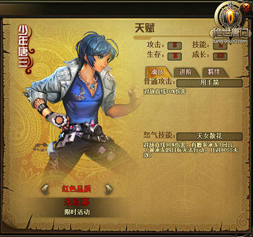 少年唐三的普通魂技甩手箭,可以对处在一条直线上的敌人造成70%的伤害。从伤害的角度来看,少年唐三的普通魂技并不出众。但是作为一个控制系的伙伴,少年唐三的强大却体现在其怒气技能天女散花所打来的控制效果-冰冻。天女散花能对直线上的敌人造成90%的伤害,同时有几率让敌方伙伴和主角被冰冻。冰冻后的敌方伙伴将在本回合中无法进行攻击。这一技能的强大控制效果,也使得少年唐三在战场中,改变或影响战局最终走向。