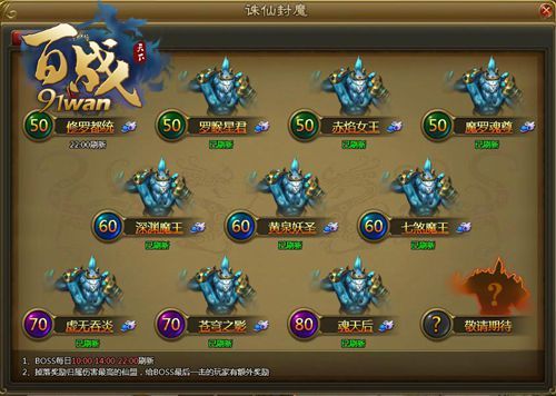万人同战,再续神魔传奇!91wan《百战天下》采用流畅的即时战斗模式,让玩家可以获得大型MMORPG的游戏体验。简单的操作和游戏前期大量的新手引导,让玩家可以更快速地上手游戏操作、熟悉游戏各项功能及玩法!大家还不快抢占先机,快人一步,成为世界的王者!热血激战,就等你来!