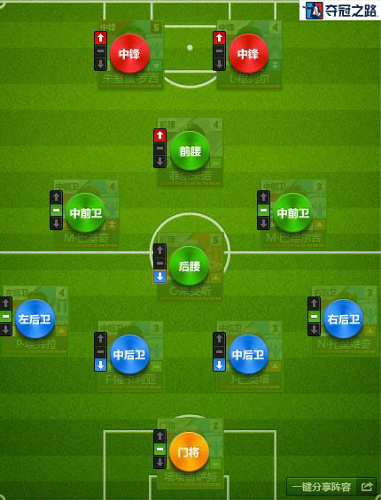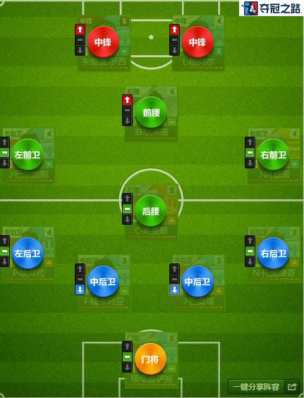 在上次更新之后,《夺冠之路》中增加了多达75种新阵型。如此多的选择,可以说完全打破了之前一些固定阵容和球员搭配的局面,相信各位教练们也都开始在钻研新阵型,力图找出一个强力组合克敌制胜。在这里,我们推荐一款442小菱形阵型,列出与大家分享: