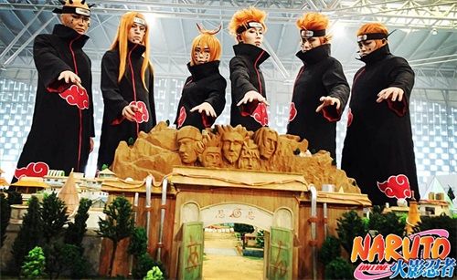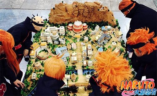 而另一些粉丝自发组织线下活动,coser火影忍者中经典人物与沙盘合影。“鸣人”与“佐助”出现在木叶村门口,让我们回想到他们还在忍者学校时的场景,又或是佐助为了完成自己的“使命”而将要离开木叶村时的画面。佩恩六道六人紧围木叶村,佩恩入侵时的画面历历在目,真人的coser与“实体”木叶村的出现,让我们身临火影世界一般。