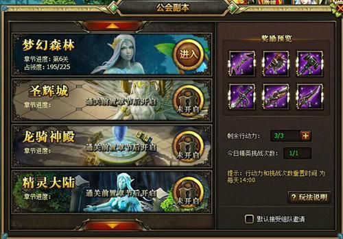 玩家每天都可分配到3点的行动力,每点行动力可令你进入一次公会副本获取稀世神器,也就是正常来说你每天只有3次的机会进入公会副本,而精英挑战次数只有1次。不过当然,行动力和挑战次数在每天的14点就充值了,这个对于在白天玩游戏的玩家来说十分方便。进入副本后,玩家可以首先和你出生入死的兄弟组成队伍,共同开展这场奇幻凶险之旅。一个副本中的敌人极多,选中你想要挑战的NPC和关卡,看中你需要的武器,就可以与其对话开始挑战了。