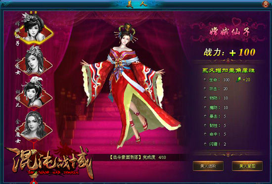 成功的路上,怎能没有美人相随?37《混沌战域》美人系统助你俘获女神芳心!玩家点击游戏界面下方的“美人图标”即可进入系统界面,一窥美人娇容。游戏中第一位美人在玩家升级到16级左右即可通过任务完成获得,而后续的更多身材更妖娆、属性更诱人的美人,玩家就需要通过艳遇副本,击杀副本中拦截美人的恶魔才能获取芳心了!玩家还可以通过美人进阶、美人飞升,让自己的宠姬获取娇艳外形和超强属性!