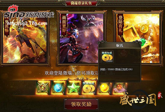 随着进驻率节节升高,为让各位玩家更加高效、便捷地体验游戏,《盛世三国2》对微端进行了一次全面优化,而新版微端就相当于为每位玩家开启了一个金钱BUFF,用它登陆进入游戏后,所有奖励铜钱的地方,都会有10%的加成,日积月累、积少成多,妈妈再也不担心我装备强化没铜钱啦!另外,下载微端后,使用微端登录游戏,即可领取海量极为珍贵的游戏道具与铜钱,具体如下:神龙盘*1,宠物进阶丹*5,绿星石*5,铜钱*50000,宠物升级丹*5,初级回春丹*10,如此丰富多彩的嘉奖,诸位誓夺天下大权的枭雄豪杰切勿错过哟!