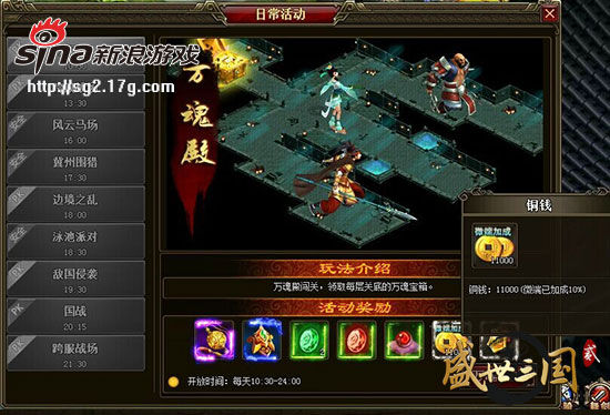 铜钱奖励10%加成作为国战网游收山之作,《盛世三国2》采用全新引擎开发,并将游戏的画面、战斗及系统同步推崇到“端游级”高度,精美古朴的水墨基调、血脉贲张的格斗氛围、端游品质的打击特效真正为玩家诠释了一款前所未有的水墨国战。更有屠屏国战、属性定制、杂事统管等“六大干”特色系统强势出击 ,届时,你将抛弃一切烦恼,无忧无虑一干到底!相信在《盛世三国2》中,你不仅可以看到前作经典的延续,还可品味出精彩纷呈的全新篇章。另外,为满足各个领域用户群体的需求,《盛世三国2》特此植入了“三端”游戏运营理念:高速便捷网页端、“随下随玩”的微端、稳定细腻客户端的三核运营将适用于身处各个领域的不同玩家。