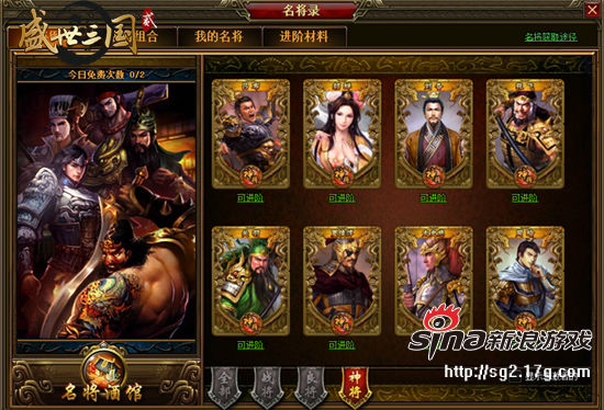 玩家激活的名将可在“我的名将”里查看,并且可以将名将卡进阶到更高品质。进阶到绿色、蓝色、紫色需要不同的进阶值,进阶到橙色必须使用神将卡。战将最高可进阶到蓝色、良将最高可进阶到紫色、神将最高可进阶到橙色。进阶时优先使用多余的“战将卡”,战将卡使用完会自动使用多余的“良将卡”。