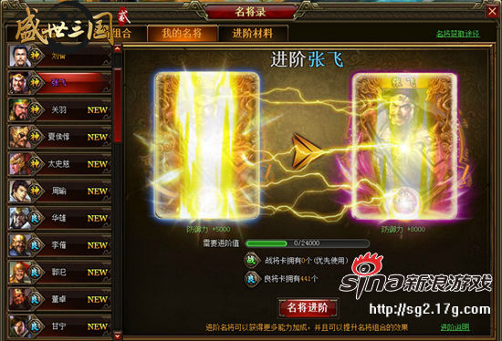 名将卡第一次获得时就直接激活,并加成相应的属性。重复获得的名将卡会自动进入“名将录”的“进阶材料”里,作为进阶名将时使用的材料。1张战将卡=100进阶值,1张良将卡=240进阶值。