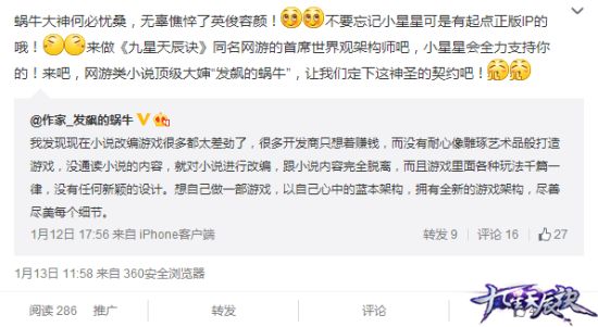 Youxi.com力斩起点中文网《九星天辰诀》正版IP授权,官方微博对“发飙的蜗牛”做出互动回复,邀请“发飙的蜗牛”出任《九星天辰诀》同名网游首席世界观构架师。将全力支持他,让他成为“艺术家”,用心雕琢出一款游戏精品。“发飙的蜗牛”不仅是文笔精湛的人气小说写手,更是一个资深级网络游戏玩家,被誉为“网游类小说的顶级大神”,在众多受邀参与游戏研发的作家当中,绝对当属首席。
