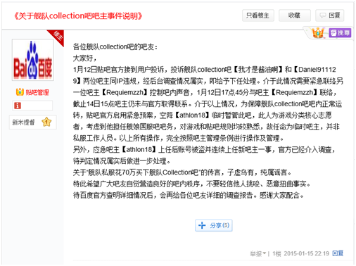 该账号被盗3、1月14日,随后以《舰娘国服》名义在“舰队Collection”吧发布的挑起事端的置顶帖,以及精品贴被删事件,并非《舰娘国服》所为,也非有争议的新吧主所发(如图)。置顶帖所发布的内容也与《舰娘国服》的实际运营策略不符。吧主中甚至出现了售卖贴吧ID的商家,和一个超过贴吧设定等级的账号,事情发酵后又由这些吧主发出了维稳的置顶贴。如果《舰娘世界》已经获得贴吧的控制权,这些混乱的操作从何而来。