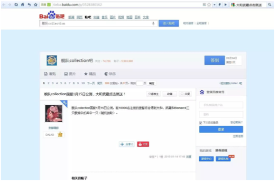 1月14日下午,百度“舰队Collection”吧三名吧主被撤职,随后百度官方空降了一位志愿者作为吧主管理贴吧(以上内容在百度官方贴吧管理于15日在“舰队Collection”吧发布的《关于舰队collection吧吧主事件说明》一文中可以证实)。紧接着,在“舰队Collection”吧出现了一个新置顶帖,其内容则是以《舰娘国服》名义发布的一条有关于公测的消息。