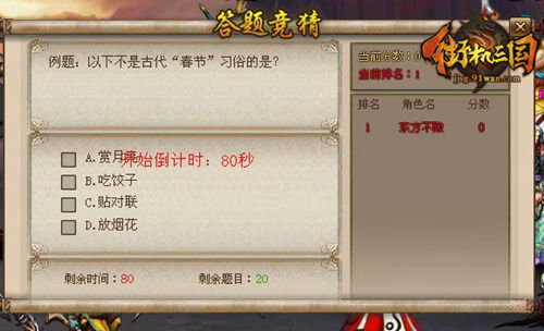每天晚上的七点开始,大家都在干什么呢?在独自意淫还是寂寞难耐?我们还是来点健康益智的吧——答题竞猜。“答题竞猜”超人气活动涵盖很多方面,保证可让玩家们大涨姿势。也许这还不是重点,重点是答题之后的奖励。答题竞猜结束后,系统会根据得分排名给予相应的奖励。排名越高,所获得的声望、金币等额外奖励就越高。