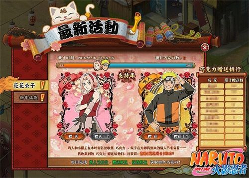 啊哦,节日安排好像包含2月14日呢!2015年情人节《火影忍者OL》的世界似乎也没发生什么大战斗。不过是小樱和鸣人正在木叶村各处收集巧克力,似乎在准备着什么……各位火影玩家在2月12日——2月16日活动期间,完成每日登陆、情人节任务、游戏中赠送玫瑰或收到玫瑰等动作,皆可获得巧克力,交给小樱或鸣人任意一人即可兑换新忍者佐助[花花公子]碎片哟。