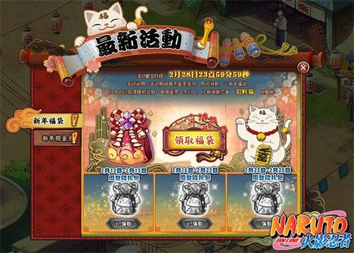 在2月12日至2月28日活动期间,诸位玩家每日上线即可领取新年福袋一个,铜币、点券、各种忍者及通灵兽招募卷轴皆在其中!另外,在持续三周的活动期间,玩家只要每周上线一次即可领取新年福袋周奖励,奖励便是新年新忍者——福禄丸。没错,就是那个游戏中每天都为大家产出大量铜币经验的萌哒招财猫,化身为忍者的它,将会带给大家怎样的战斗体验?记好活动日期,千万不要忘记亲自领取一观哦。