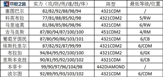 葡超巡回由葡超里面的十支球队组成通过表格分析可知,葡超三杰(里斯本竞技、本菲卡、波尔图)的实力明显高出其他球队。纸面实力波尔图居首,基本可以达到意甲那不勒斯、紫百合级别;实际联赛成绩本菲卡领跑,虽然她在本赛季大出血,卖了很多主力。然而与其他顶级联赛对比,葡超整体还是稍显不足,七大联赛只压过了荷甲。同时,多达8支的葡超球队采用4321边锋的边路进攻打法,可以参考之前官网攻略并结合巡回球队的软肋(某位置等级明显低的球员)采取相应打法。通过对葡超巡回的分析,我们也能大致了解现实中本赛季葡超球队概况,或许可以找到他们比赛成绩与实力、阵型等方面的关联。