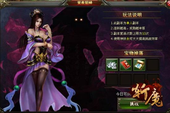 更为可怕的是,随着《斩魔》营救貂蝉副本回合数量的增多,你所要面对的敌人也将变得愈发强大,而你却无法在战斗中补血、补篮,只能依靠纯粹的实力“硬抗”到最后。此外,“无限制回合”设定也将让这场挑战难度升级,你所要做的是通过不断斩杀强敌,获取强上更强的BUFF属性加成,进而从最后一道关卡的BOSS手上救出貂蝉美人!