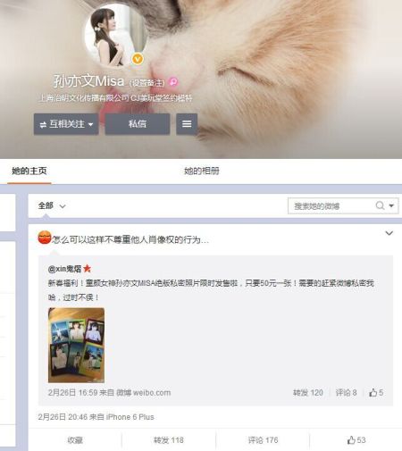 近日,知名人气showgirl网络红人孙亦文misa的私密照片被粉丝公开售卖,引起了广大网友关注。孙亦文在自己微博转发了该粉丝微博,强烈谴责了该粉丝无底限不尊重他人肖像权行为。瞬间引起了广大网民关注讨论,多数粉丝们都纷纷谴责该行为,也有少数心怀不轨的网友称赞说好。