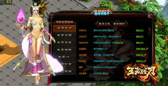 《王者战刃》将经典的“传奇”风格通过页游全景展现,多种经典战场已全数开放,千人混战、帮会战、以及城战等等数次掀起热血高潮。除此之外,游戏更优化了玩家引导系统,自动化引导与“每日必做”按钮可以清楚直白地指引玩家,从战力提升、玩法指引以及社交等方面让玩家在游戏中不求人,顺畅地从新手成长为独当一面的热血英雄!