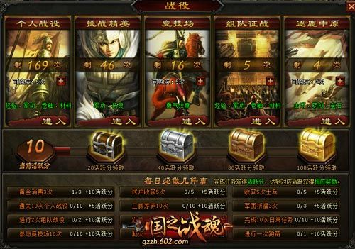 各大战役带你征服三国!602《国之战魂》中有各种各样大大小小的战役让我们玩家挑战,每种战役挑战方法不同,难度各异,奖励亦有不同之处。个人战役分章节挑战;挑战精英可以获得军功与将灵;竞技场中可以与好友切磋。还有组队征战以及逐鹿中原。丰富的玩法与奖励,尽在602《国之战魂》!602《国之战魂》玩家QQ群:304374230