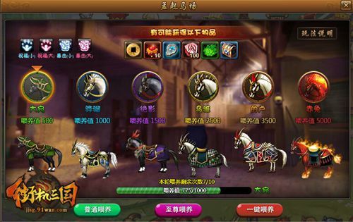 91wan《街机三国》孟起马场是天下仁人志士培养良驹宝马的重要场所。在系统中,玩家可培养不同品质的马匹,每次喂养都有概率开启或触发增益效果,为本轮喂养带来额外的好处;喂养一轮即10次之后,系统将根据玩家累计的喂养值,激活相应品质的马匹,获取奖励。