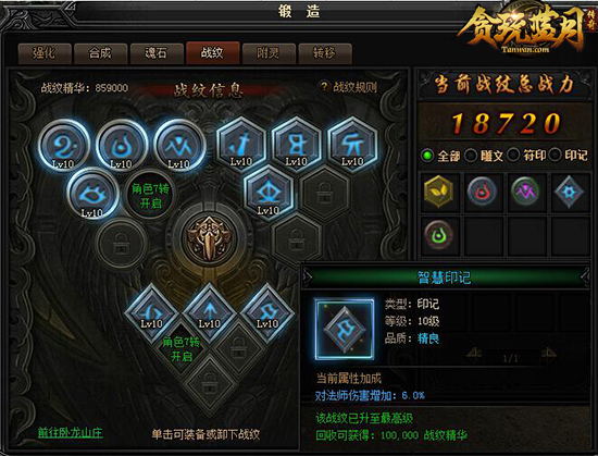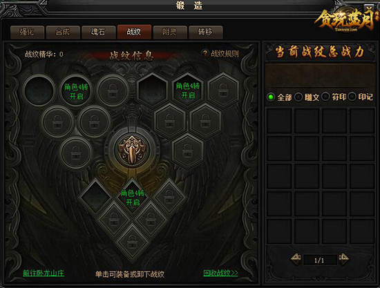2017年1月18日,《贪玩蓝月》更新玩法,首次推出战纹系统!只要是《贪玩蓝月》的玩家达到3转,就可开启战纹玩法。战纹分为“雕文(圆形)、符印(六边形)、印记(菱形)“三大类”,每一类的战纹都搭配不一样的性能。转生的级数越高,可解锁的凹槽越多。《贪玩蓝月》的玩家努力吧!