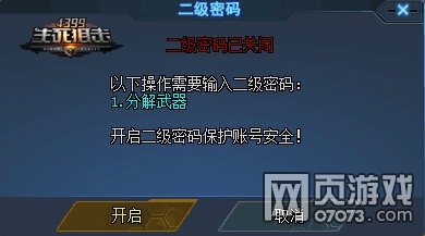 二级密码默认为关闭状态,点击“设置”,选择“开启”,二级密码可由6-10位大小写英文字母、数字和特殊符号组合而成。在此界面中,可以看到二级密码在“分解武器”的操作中,需要输入二级密码进行验证。赶紧开启你的二级密码,保护账号安全吧。