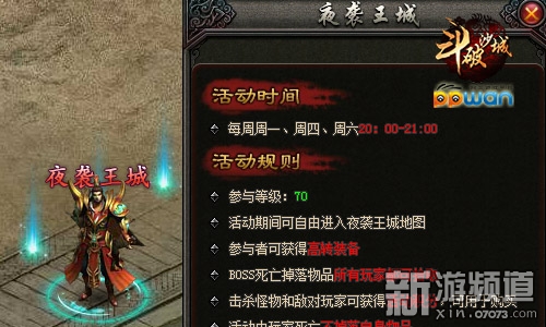 当夜幕开始降临,大地被黑暗笼罩,即每周一、四、六的20:00-21:00,黑夜的暗杀者们开始磨刀霍霍,准备向王城进发。在ppwan《斗破沙城》中,只要等级达到70级,都可以在九洲城的夜袭王城NPC处进入夜袭王城的地图,成为暗杀者中的一员!