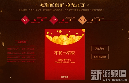 让红包雨来的更猛烈些吧!5.1日到5.3日活动期间,51游戏“玩家节”的活动页面每天两波疯狂红包雨,14:00-15:00、20:00-21:00每轮发放5151个红包,持续一个小时,直至红包被抢完。而在这些红包里有51币红包也有返利红包,有多也有少,能抢到什么样的红包就各凭运气了。而抢夺资格更是最低门槛,只要你是51游戏用户或者注册51游戏账号,都可以来抢夺红包。记住我们红包雨时间,等你来抢!