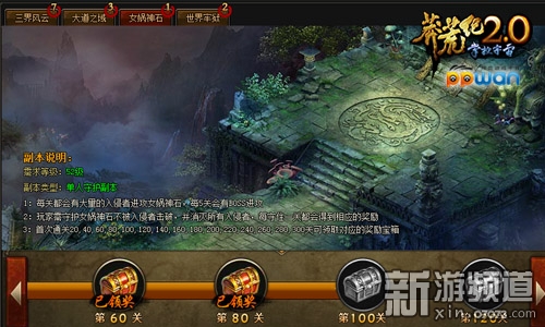 女娲神石在ppwan《莽荒纪》中属于单人守护副本,只要达到52级就可以参加。在女娲神石副本中,共有300关等着玩家守护,每关都会有大量的入侵者进攻女娲神石,每5关将会出现一大BOSS进攻。玩家的主要任务就是守护女娲神石不被入侵者击破,并且消灭所有的入侵者,每守住一关都会获得相应的奖励!此外,玩家首次通关20、40、60、80、……、300关时,还可以领取对于的奖励宝箱哦!
