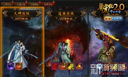 世界牢狱虽然是ppwan《莽荒纪》中的单人副本之一,但是更多的被称为VIP副本,顾名思义,这不是面向所有玩家的单人副本,这是VIP玩家们的私人副本。当玩家成为VIP1时,就可以开启天神囚徒、当玩家的VIP等级达到6级时,将会开启道祖囚徒,当玩家的VIP等级达到9级时,世界囚徒将会为你开启,各种极品道具等你来拿!