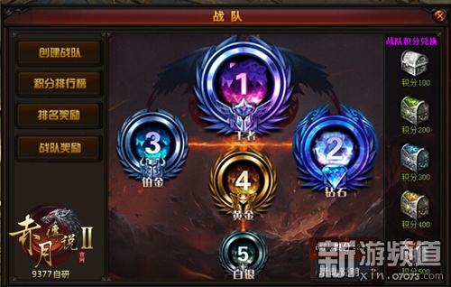 9377《赤月传说2》玩家可在战队界面内消耗1000元宝创建由自己命名的战队,并邀请两位好友加入战队。战队积分将参与全区全服积分排名,进入前八名的玩家在结算时获得战队排名称号奖励。9377《赤月传说2》战队积分达到对应级别如白银、黄金、白金、钻石和王者分段时,可领取阶段积分奖励!!