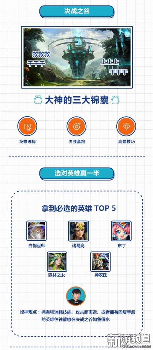 在全民决战争霸赛中,比赛选用的地图是决战之谷这一经典的英魂地图。参赛成员操控的英雄均由随机生成,所有玩家将在仅有的几个随机英雄当中进行选择,所以如何挑选合适的英雄是非常关键的。峰神列出了他认为拿到必选的五大英雄:白袍巫师、诸葛亮、布丁、森林之女、神农氏,这些英雄有一类特性,那就是攻击距离一般都属于长手型、消耗能力较强,或者是拥有加血、加攻速移速等技能,辅助队友的能力强,因此这些英雄能够在没有泉水回复的决战之谷里如鱼得水。