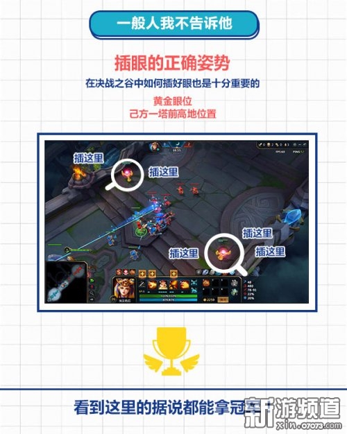 在决战之谷中,视野和眼位是非常重要的一环,“没有视野不成方圆”的真理影响着一代又一代电竞大神。而在游戏中由于真眼的侦测范围较小,所以在决战之谷己方一塔外的高地最左和最右的两个位置是最好的黄金眼位,占据了这两块视野,就可以对中间的视野掌控无疑,而敌方为了排眼就不得不冒着被我方英雄集火的危险来插真眼反眼。峰神建议两个眼位必须争夺下一个才能保证前中期的视野压制,从而打开前期局势。
