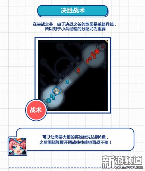 众所周知在《英魂之刃》中有些英雄被称作“5级怂包6级成神”,6级的终极技能可以直接决定团战的胜利。在决战之谷中,由于地图是单路兵线,因此对于小兵经验的分配更为重要。观察第一届全民决战争霸赛中可以发现,大神在打比赛时,通常都会让布丁、二郎神等这类有强力大招的英雄优先达到6级,之后围绕其展开团战往往能百战不殆!