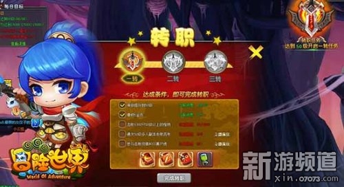 腾讯平台《冒险世界ol》开启转职系列玩法,玩家可以通过转职任务获得转职属性技能书。学习技能后玩家角色将能获得本职业的强力专属属性。转职共分为三个阶段,在游戏界面的右上方可以看到转职任务图标提示。