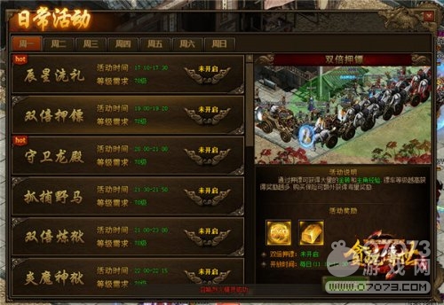 虽然只有二十分钟,但是有2个时间段供玩家选择。即使错过了一个活动时间,也可以等待下一个双倍活动时间。活动开启后,找到镖头即可开始押镖了。记住,镖车等级越高,奖励越好。在双倍押镖时间内押送黄金镖车,玩家可以获得大量金砖和主角经验,奖励相当丰厚!