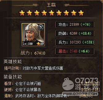 目前版本内王翦的专属装备有龙魂昆吾剑、惊鸾锁子铠、钩蛇印这三个,分别可以提升24%的攻击、防御和兵力属性,而且不仅如此,百将天下蓝色以上品质的装备还附加有装备技能,王翦的这三件可以提供看穿、硬撼、遏制这三个技能,使得王翦在每次攻击的时候不会被闪避掉,也不会受到暴击,在每次武将存活的时候,敌人的防御力是降低的,也算是间接提升我方整体的伤害输出了。