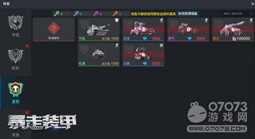 在《暴走装甲》游戏的载具工厂中,打开星拓阵营装甲界面,可以看到最新推出的三部钻石限定装甲,三部装甲分别名为流星、风暴、勇气,他们均只能通过使用游戏内钻石货币进行兑换。